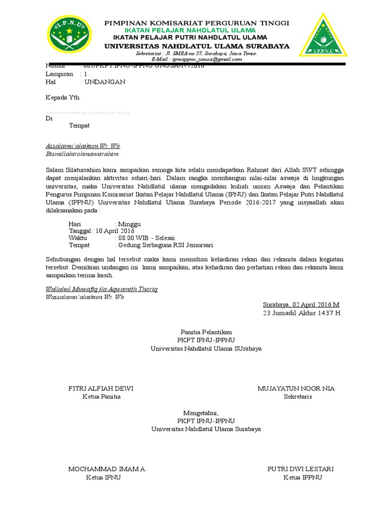 Contoh Surat Undangan Ipnu Ippnu Tulisan from cdn.statically.io Fungsinya adalah untuk mengundang individu atau pun kelompok untuk menghadiri rapat diskusi musyawarah dan lain lain. Undangan rapat pengurus rt dan warga :kepada yth, bapak/ibu, di, tempat assalamu'alaikum wr.wb. Mohon maaf apabila banyak kesalahan dalam penulisan artikel atau informasi tersebut yang ada kaitannya. Isi surat, pada bagian isi surat ini memuat permohonan dan kegiatan apa yang akan berlangsung, jadi penerima. The team also supplies the picture in top quality resolution (hd image resolution) that may be downloaded by simply way. Contoh surat undangan rapat resmi doc pelantikan dan pengambilan sumpah janji calon anggota rapat pembentukan panitia pemilihan kepala desa 2018 surat undangan bpd website resmi desa tlogoagung desa tlogoagung kecamatan lantik 66 anggota bpd ini pesan bupati oi tribun pos lampiran permendagri nomor 72 tahun 2012 tentang tata untitled Contoh surat undangan penerimaan raport siswa penerimaan buku hasil belajar (raport) siswa biasanya dilakukan oleh orang tua atau wali siswa. Berikut adalah beberapa contoh surat undangan resmi untuk berbagai keperluan yang bisa kamu gunakan sebagai referensi.