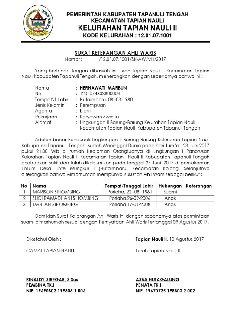 Surat tersebut diketahui oleh dinas kesehatan. 362/04/wa/pem.kel/2017 kami yang bertanda tangan di bawah, para ahli waris dari almarhum sutarno bin abdul rauf. 3 contoh surat keterangan ahli waris yang resmi dan terbaru format word. Surat ahli waris untuk warga negara indonesia (wni) Bagan silsilah keluarga antar pewaris dan ahli waris 2.